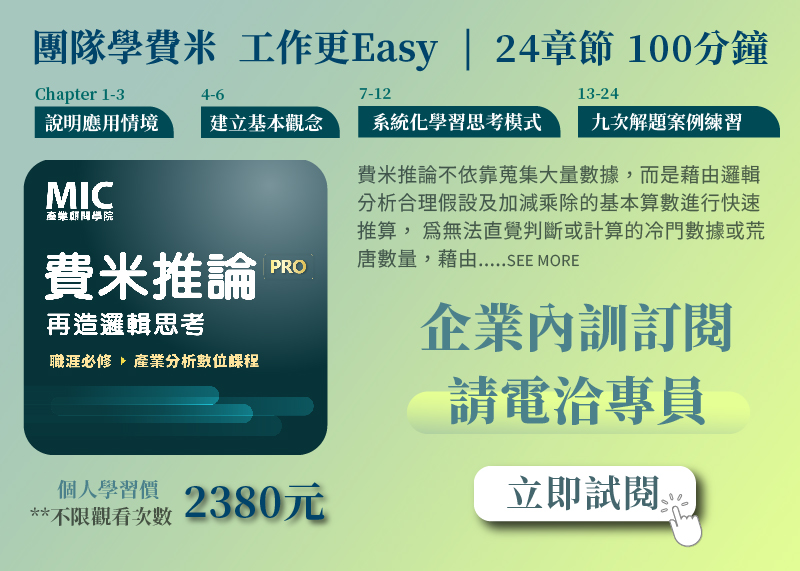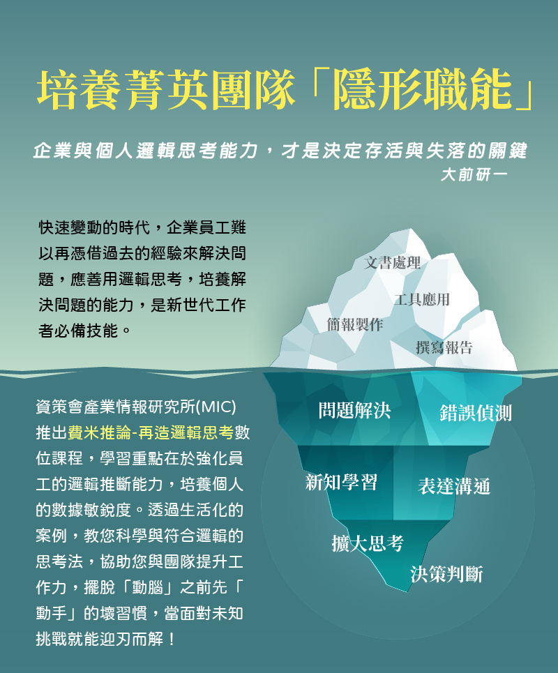 「企業與個人邏輯思考能力,才是決定存活與失落的關鍵」---大前研一 快速變動的時代,企業員工難以再憑借過去的經驗來解決問題,應善用邏輯思考力,培養解決問題能力,是新世代工作者必備的能力。 資策會產業情報研究所(MIC)推出《費米推論-再造邏輯思考》數位課程,學習重點在於強化員工的邏輯推斷能力,培養個人思考。透過生活化的訓練案例,教您科學與符合邏輯的思考法,協助您與團隊提升工作力,擺脫「動腦」之前先「動手」的壞習慣,當面對未知挑戰就能迎刃而解!「員工學費米,工作更Easy」。