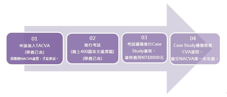 參加 CVA 線上考試者,可取得繳交英文評價報告受審核的資格,通過英文評價報告審查者,即可授證;而未通過者,可在三年內重新提交報告再次審查。