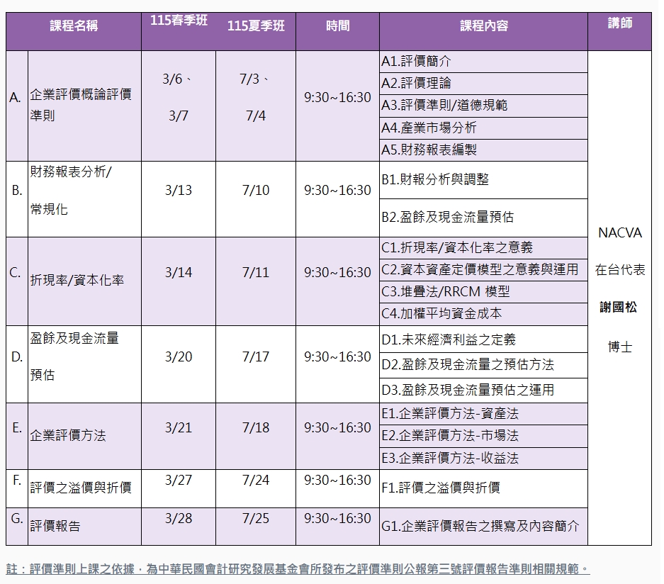 【階段一】企業評價課程表 48 小時/8 天(可同步數位直播)