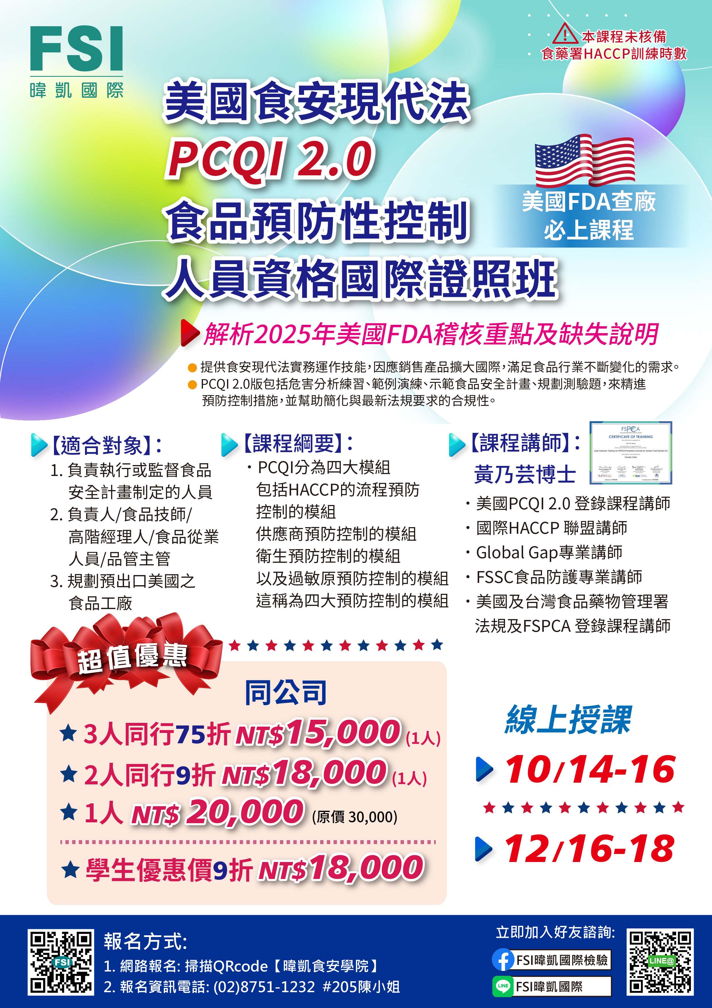 美國食安法-PCQI 2.0人員資格國際證照培訓班