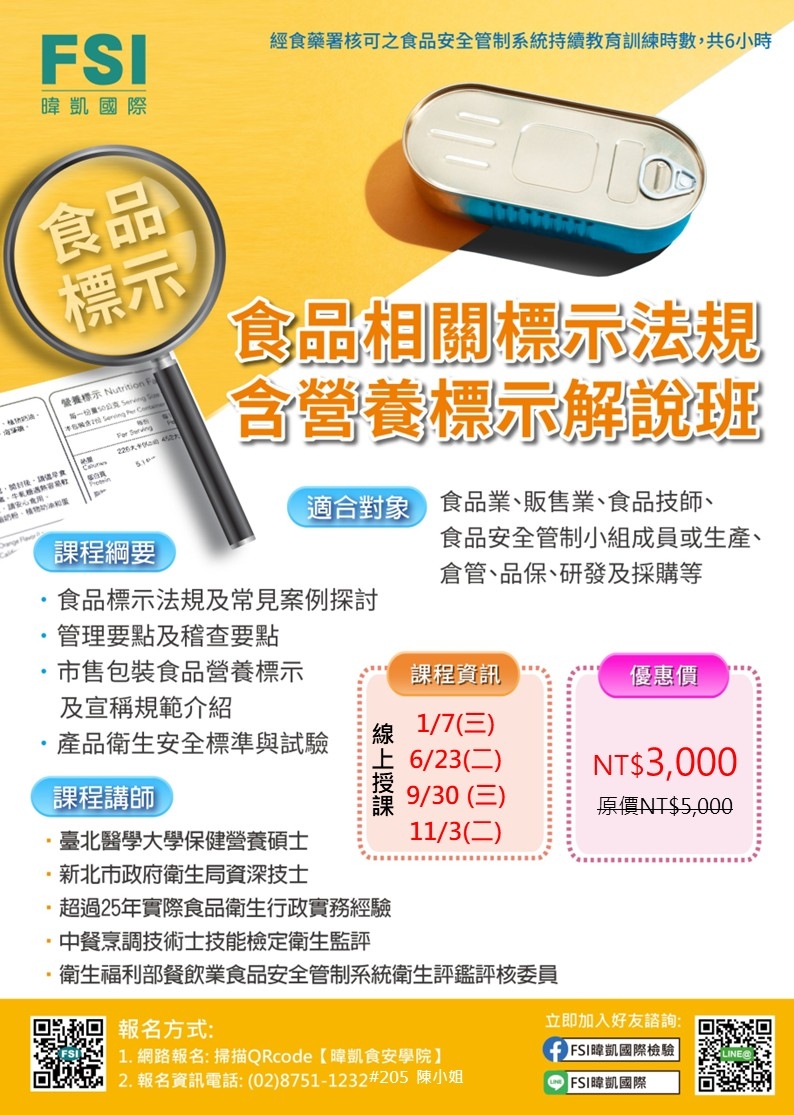 【FSI 暐凱食安學院】衛福部食藥署之持續教育訓練課程~ 開放報名中!~