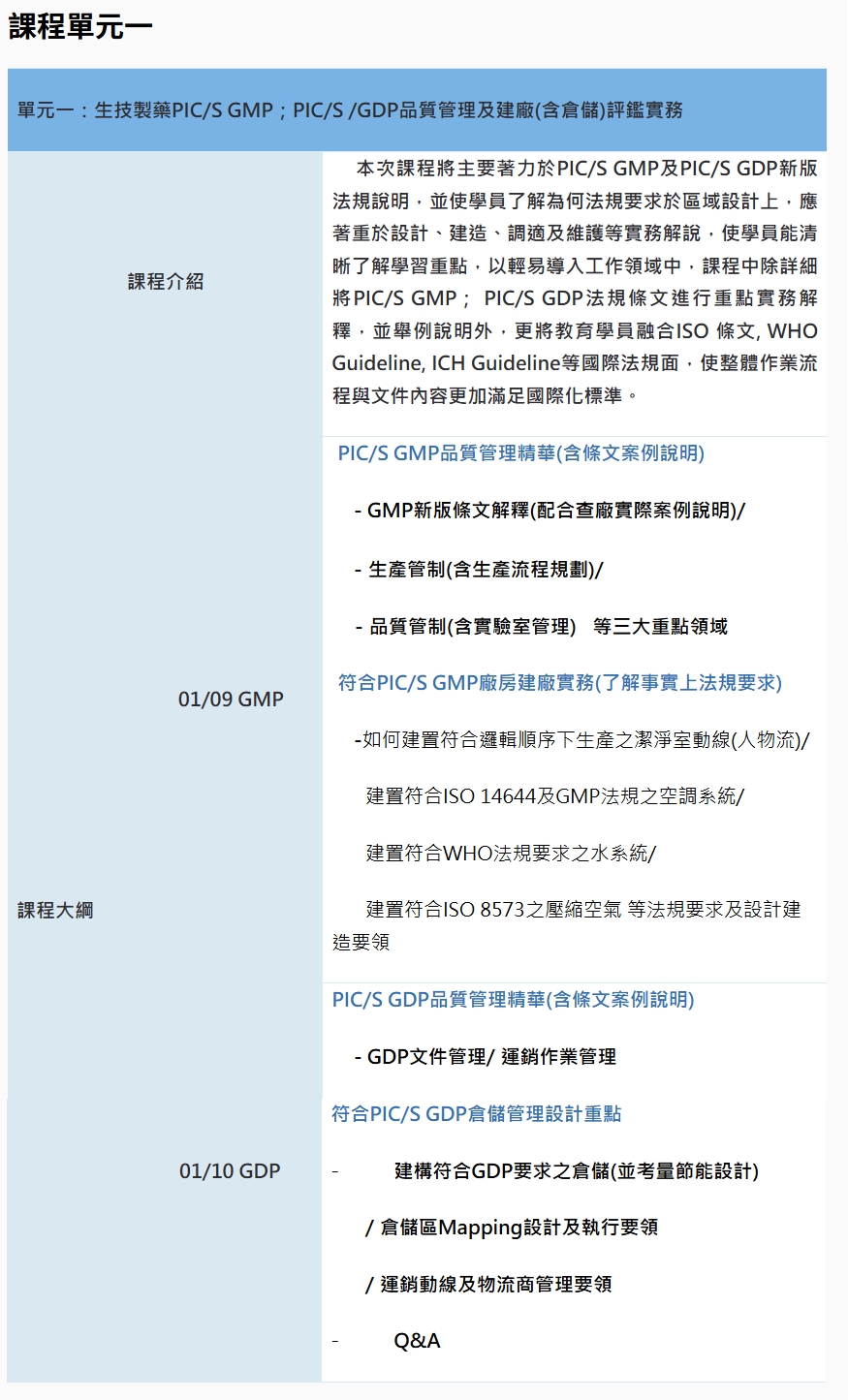 單元一:主要著力於PIC/S GMP及PIC/S GDP品質管理及區域設計重點實務解說,使學員了解兩套目前最重要的規範標準,藉由此次法規重點精華說明,將最新PIC/S GMP導入於現行作業範疇中,確認流程與作業方法均能符合要求,並且清楚認知廠房及支援系統規範,為何需滿足設計、建造、調適及維護要求後,進而導入風險管理措施以設計或再次審閱相關設施系統,審視是否真正滿足目前最新法規要求,避免因法規觀念日益更新,導致廠房及設備也必須被迫要求一直修正或更新。建立GMP生技藥品生產作業環境後,亦需符合PIC/S GDP規範,以風險管理立場,規範倉儲區域環境溫溼度與及管理含運銷商整體在內之運銷流程,以落實保證藥物品質。