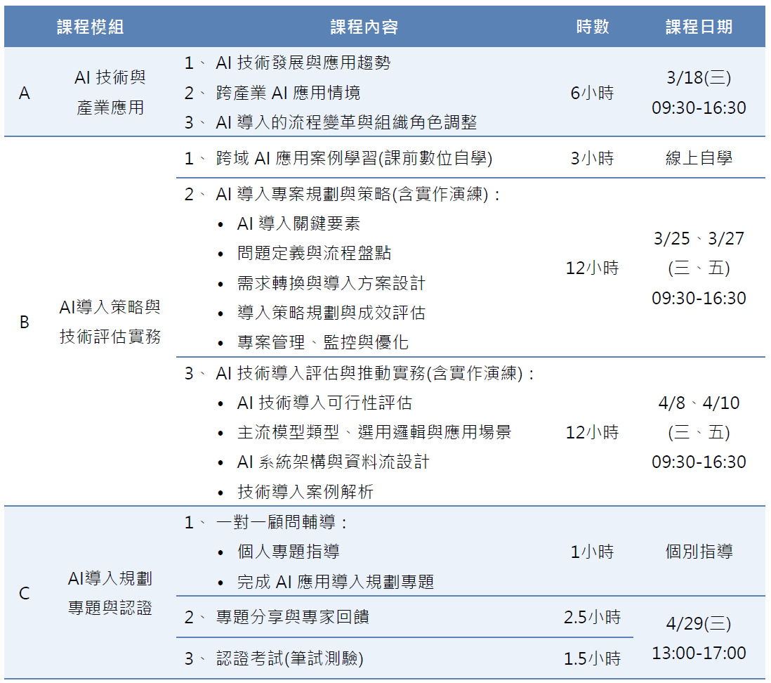 - B、AI導入策略與技術評估實務(27小時):AI 導入策略 × AI技術評估(強化導入規劃能力)